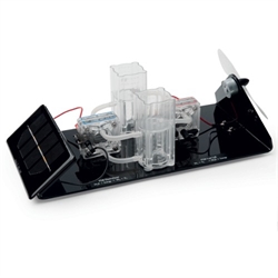 Model showing the function of a hydrogen solar cell consisting of solar module, PEM electrolyser, hydrogen and oxygen accumulators, PEM fuel cell and fan. Conveniently arranged on a baseplate.