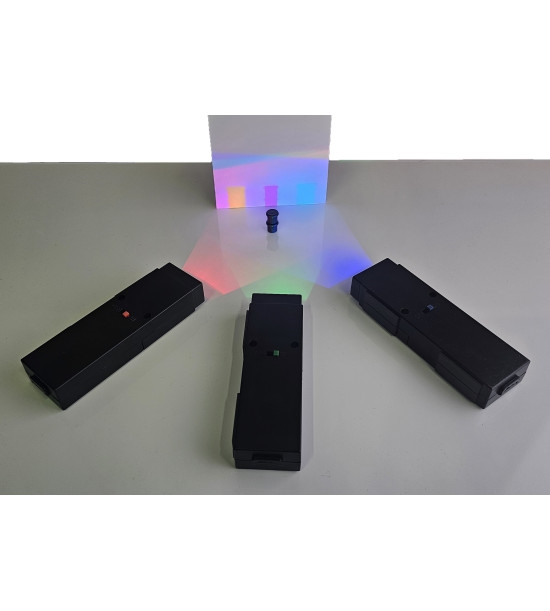 This set contains three LED light sources - red, green, and blue. It is designed specifically for hands-on demonstrations in geometric and color optics. Each LED source comes with a removable attachment that narrows the beam into a thin light line, making the set suitable for experiments involving light rays, reflection, and refraction. The LEDs without the attachment produce a wide, expanding beam, enabling clear demonstrations of color mixing. By directing the colored beams onto a surface students can observe additive color blending. The set also works exceptionally well for shadow-based color experiments, where illuminating a small object with all three beams creates colorful and visually engaging shadow patterns. Light sources cointain magnetic foils for attaching on the magnetic boards.
