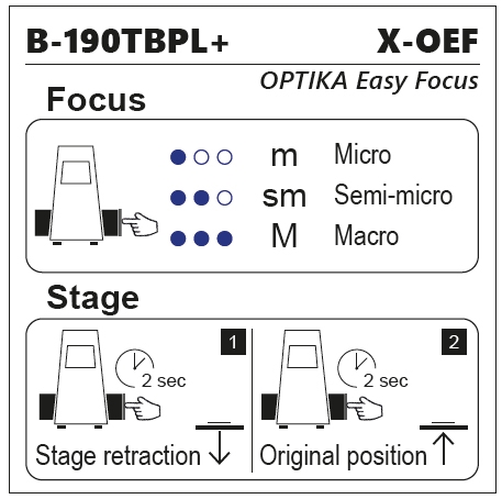 B-190TBPL+ ,  5Mp camera and a fully electronically controlled triple motorized focus adjustment: Macro, Semi-Micro and Micro. The new X-OEF system (Optika EasyFocus system) replaces the classic mechanical focusing system with an innovative solution that allows more functions.